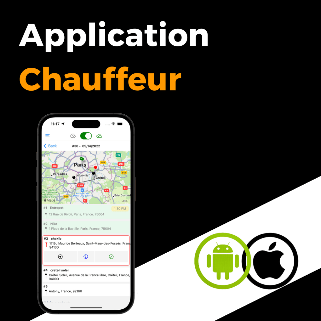 Découvrez l’application chauffeur, facile à utiliser et riche en fonctionnalités. Profitez de la navigation avec Google Maps ou Waze et déposez photos, signatures et réservations en toute simplicité à chaque étape. La CMR est automatiquement générée et accessible depuis votre tableau de bord. L’application est disponible sur Android & iPhone.
